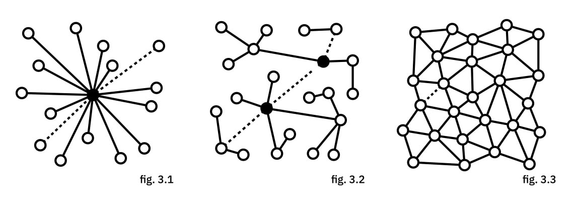 Fig. 3 : Différents systèmes d’interrelationsCentralisé [Fig. 3.1] (ex. : Paypal, Western Union), polarisé [Fig. 3.2] (système bancaire actuel), distribué [Fig. 3.3] (Bitcoin). On remarquera que seul ce dernier ne fait pas appel à un tiers de confiance (points noirs) pour fonctionner.