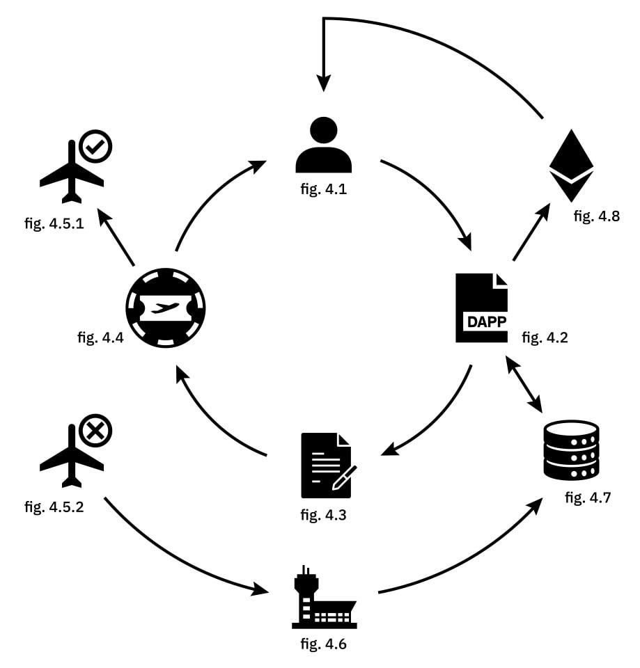 Fig. 4 : Fonctionnement des smart-contractsL’utilisateur [Fig. 4.1] va envoyer des ethers à l’application décentralisée (dApp) de la compagnie aérienne [Fig. 4.2] qui va enregistrer la transaction dans un smart-contract [Fig. 4.3] et créer un token-billet [Fig. 4.4]. Ce jeton sera dépensé (détruit) lors de son utilisation [Fig. 4.5.1]. Si le vol est annulé [Fig. 4.5.2] un oracle [Fig. 4.7] connecté au réseau de l’aéroport [Fig. 4.6] déclenchera le smart-contract qui remboursera, au travers de la dApp [Fig. 4.2], l’utilisateur en ethers [Fig. 4.9].