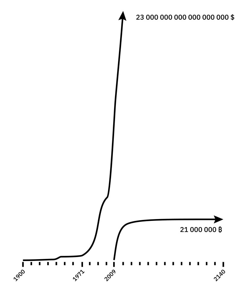 Fig. 2 : Comparaison or/bitcoinLes accords de Nixon en 1971 ont été suivis d’une hyper inflation du dollar (émission multipliée par 57 entre 1970 et 2018). A contrario de ce développement exponentiel, l’émission des bitcoins suit une courbe logarithmique pour atteindre le nombre maximal de 21 millions de bitcoins émis.