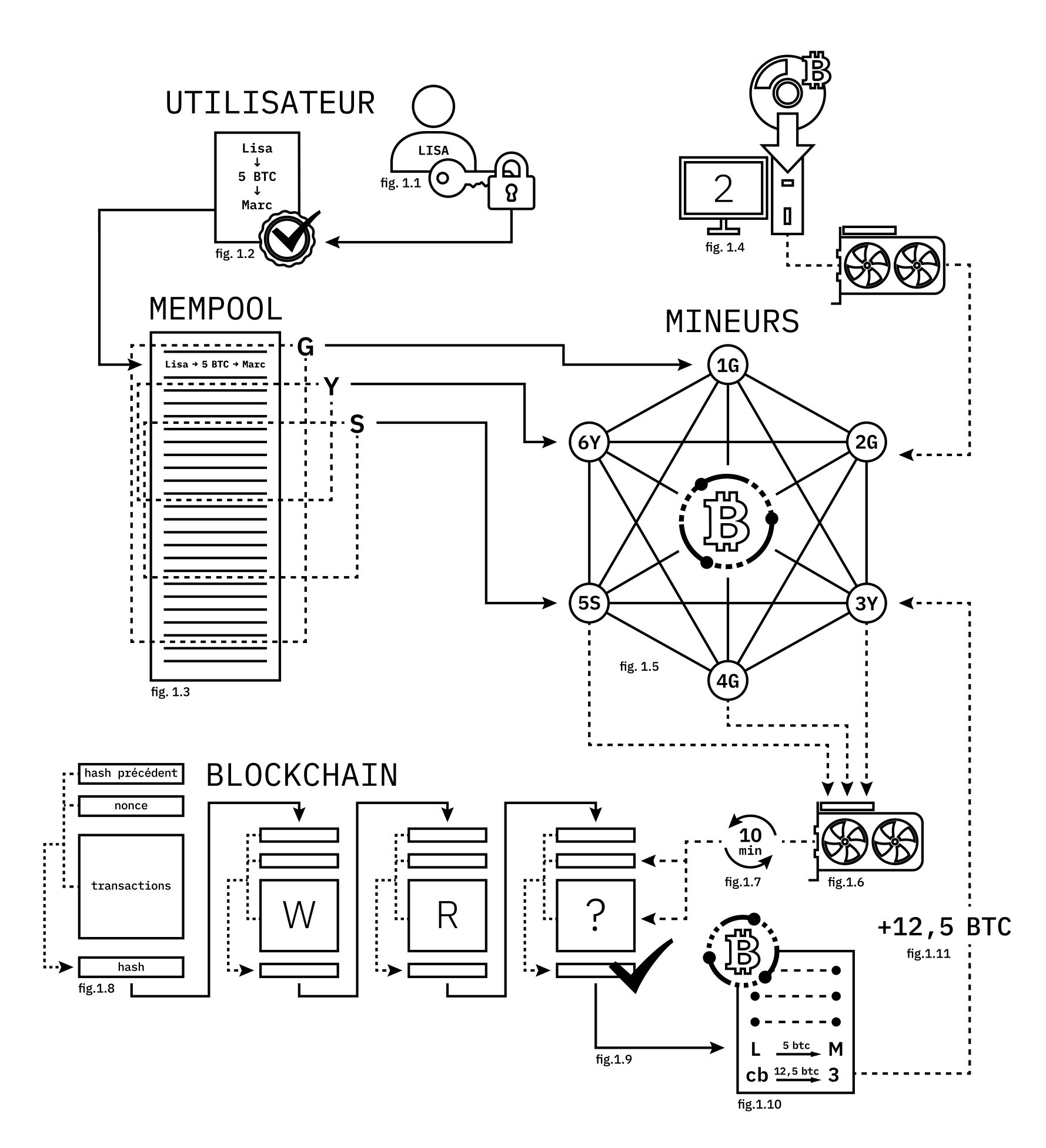 Fig. 1 : Fonctionnement technique du protocole BitcoinPour envoyer 5 bitcoins à Marc, Lisa va utiliser sa clé privée [Fig. 1.1] pour signer sa transaction [Fig. 1.2] qui sera mise en attente dans la mempool [Fig. 1.3]. Les mineurs [Fig. 1.5] ayant préalablement téléchargé le logiciel-client Bitcoin et alloué leur puissance de calcul au protocole [Fig. 1.4] vont sélectionner parmi la mempool les transactions à insérer dans leur version du bloc à miner. Le premier mineur qui validera son bloc pourra le soumettre au réseau et deviendra, parmi toutes celles proposées (G, Y ou S), celui qui fera foi pour soumettre un nouveau bloc. Pour ce faire le mineur va devoir « hacher » son bloc pour trouver, à l’aide d’un nonce, un hash valide [Fig. 1.8]. La difficulté de cette opération est calculée au regard de la puissance totale du réseau [Fig. 1.6] pour que celle-ci prenne en moyenne 10 minutes [Fig. 1.7]. Une fois le bloc miné, celui-ci est inséré dans la blockchain [Fig. 1.9] et permet dès lors à Alice de voir sa transaction inscrite dans le registre [Fig. 1.10]. Le mineur (3), pour avoir miné le bloc, est rétribué par une transaction coinbase [Fig. 1.10] qui lui attribue, en plus des frais de transaction déjà gagnés, 12,5 bitcoins nouvellement créés par le protocole (taux appliqué jusqu’en 2020 avant d’être réduit à 6,25) [Fig. 1.11].